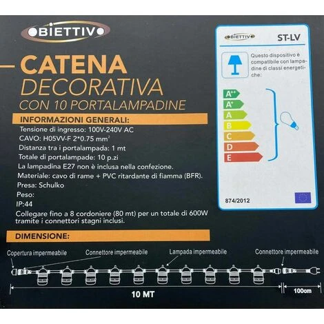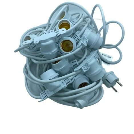 La catenaria è lunga 11 metri, di cui 10 luminosi ed 1mt cavo alimentatore (scollegabile per prolungarla) dotata di 10 portalampada (non pendenti) con attacco per lampadine (NON INCLUSE) a LED con attacco E27. Ogni bulbo dista 1 MT dall’altro.
