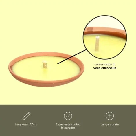 La particolarità delle nostre candele è che grazie alle ciotole di terracotta, possono tranquillamente essere utilizzata come decorazione per il vostro giardino e quindi avere doppia funzione, quella di decorare il giardino o terrazzo e in più di tenere al largo gli insetti, le zanzare in particolare