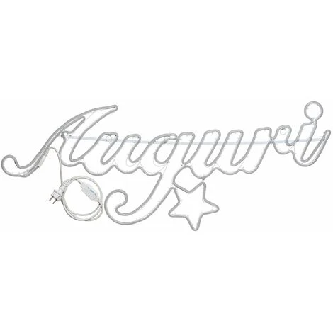 Un tubo led bianco caldo a luce fissa percorre il perimetro di un telaio in metallo bianco, che ricalca la scritta AUGURI e la forma di una stellina. Gli 840 led usati illuminano l’intero tubo, così da ricreare l’intenso effetto luminoso proprio dei tubi a neon.