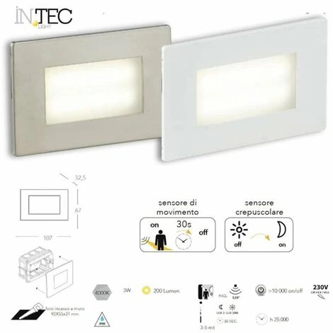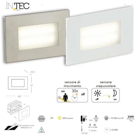 Il faretto led a parete BOLT della Fan Europe Intec è un segnapasso led con sensore di movimento e crepuscolare ad incasso nella scatola universale 503E della bticino, questo, rene la sua predisposizione molto semplice, ha in dotazione due placche intercambiabili, una di colore bianca e l’altra nickel. Il segnapasso ha un led integrato con potenza di 3W, una tonalità di colore naturale 4000K, e sviluppa un’intensità luminosa di 200 Lumen.