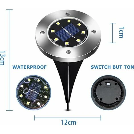 8 luci da terra solari a LED. Nel 2020, le ultime luci solari manterranno i vantaggi del LED 8 originale. Per rendere più evidenti i vantaggi delle luci solari, abbiamo migliorato la qualità e il design dei nostri prodotti. Le eleganti lampade da terra in acciaio inossidabile non sono ideali solo per la tua terrazza, balcone o giardino, ma anche per illuminare passaggi, laghetti da giardino, ecc. Con il pannello solare integrato, la lampada solare può essere caricata al sole e rimarrà accesa fino a 8 ore dopo il tramonto. Il sensore di luce diurna integrato accende e spegne automaticamente il LED di illuminazione. Grazie ai suoi speciali perni di posizionamento, puoi fissare con precisione la lampada da terra in acciaio inox sul pavimento desiderato. Dati tecnici: Materiale: acciaio inossidabile e ABS ad alta resistenza Colore della luce: bianco, colore caldo (opzionale) Pannello solare: 2v 100mA Sorgente luminosa: 8 LED Tempo di ricarica: 6-8 ore. Orario di lavoro: 8-10 ore. Batteria: batteria Ni-MH da 600 mAh Grado di impermeabilità: IP65 Quantità: 4 pezzi Abbiamo ampliato l’area dei suoi pannelli solari da 2,9 cm a 4,5 cm. Ora l’orario di lavoro delle luci solari di notte in estate può raggiungere 8-10 ore. La qualità è affidabile, il portalampada solare è cambiato dalla plastica originale al PP, che è più durevole. Poiché sappiamo tutti che il cablaggio di bambini e animali domestici è estremamente pericoloso, i nostri prodotti sono progettati senza fili e non ci sono pericoli nascosti. La copertura in vetro della lampada solare per esterni, sopra le perline della lampada a LED, aggiunge un motivo a rombi, che è bello e aumenta la capacità di riflettere la luce. Il grado di impermeabilità è IP65, il che garantisce che i nostri lampioni solari siano resistenti alla natura. La struttura antipolvere mantiene le nostre macerie. Realizzato in plastica resistente e acciaio inossidabile, è perfetto per spazi esterni come giardini, patii, terrazze e piscine. Prima di spostarli per raccogliere l’energia solare, assicurarsi che le luci siano accese. Assicurati di posizionare l’interruttore in posizione ON per caricare al sole, altrimenti puoi scegliere di posizionare la luce solare sul terrazzo, sulle scale o sull’appartamento.