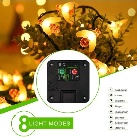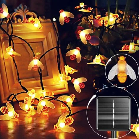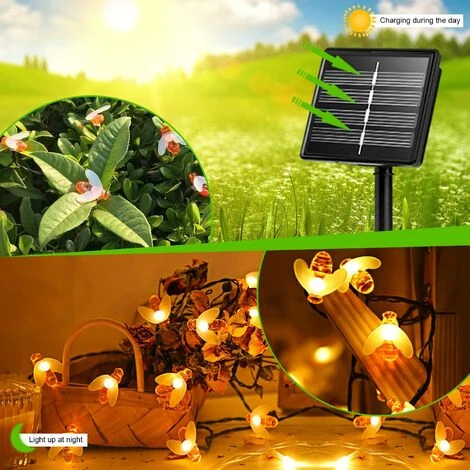 【Stringa solare per esterni Bee】12m 100 LED Stringa solare per esterno Bee. Sono più chiari e non si surriscaldano durante l’uso. È ecologico, resistente e sicuro. La lunghezza totale della stringa di luci solari da giardino è di 12 m e la distanza tra la lampada e la lampada è di 15 cm.