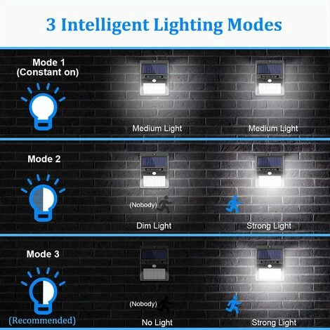 - 【3 modalità di illuminazione intelligente】 3 diversi livelli di luminosità intelligenti: 1: illuminazione costante . 2: Modalità sensore di luce forte: quando le persone attraversano l’area del sensore, una forte illuminazione dura 20 secondi. Quando le persone se ne vanno, la luce cambia in fioca. 3: Modalità del sensore di movimento: la differenza con la seconda modalità è che la luce si spegne dopo che la persona se ne va. Quindi puoi cambiare le modalità in base alle tue diverse esigenze.