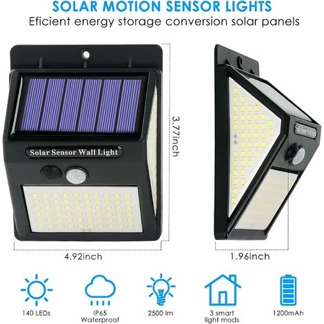 Luci solari per esterni, 140 LED Lampade da parete con sensore di movimento con grandangolo di 270°, 3 modalità di illuminazione Luci solari di sicurezza impermeabili IP65 per garage, recinzione, terrazza, Patio, porta d’ingresso, cortile – Confezione da 2 :