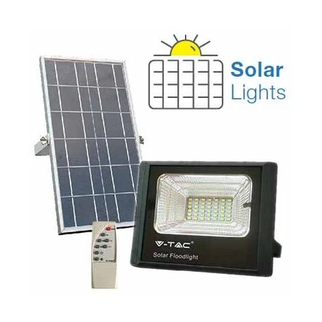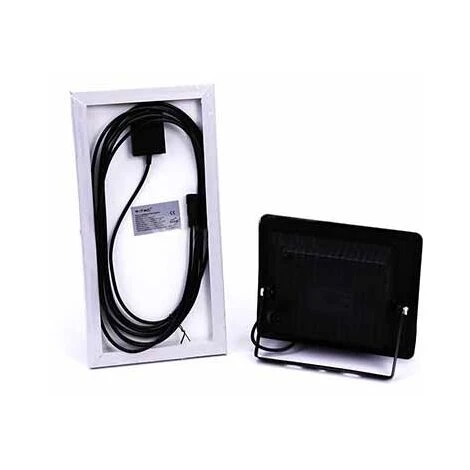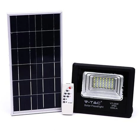 Faro LED V-TAC VT-25W con potenza di 25W luce bianco freddo 6000K, dotato di pannello solare 12W, batteria interna a litio 3,2V da 5000Mah e telecomando infrarossi per controllo a distanza delle funzioni: Accensione ON/OFF, funzione timer e regolazione intensità luminosa dimmer. Realizzato in alluminio ad alta resistenza di colore nero con vetro trasparente e riflettore interno che permette un’ apertura molto ampia del fascio luminoso della luce di circa 120°.