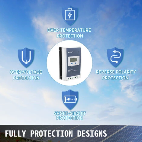 - Protezioni: Protezione da cortocircuito, protezione da inversione di polarità PV, protezione da inversione di corrente fotovoltaica durante la notte, protezione da batteria inversa, protezione da sovraccarico, protezione da sovraccarico, protezione da sovra temperatura, protezione da sovraccarico
